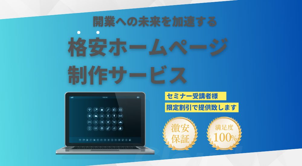 A: はい、ございます。セミナーでは、代表自身の経験(広告なしで初年度から売上1000万達成)に基づいた、集客や経営に関する考え方にも触れます。また、別サービスとして「ホームページ制作サポート」も受講者様特別価格でご提供しております。